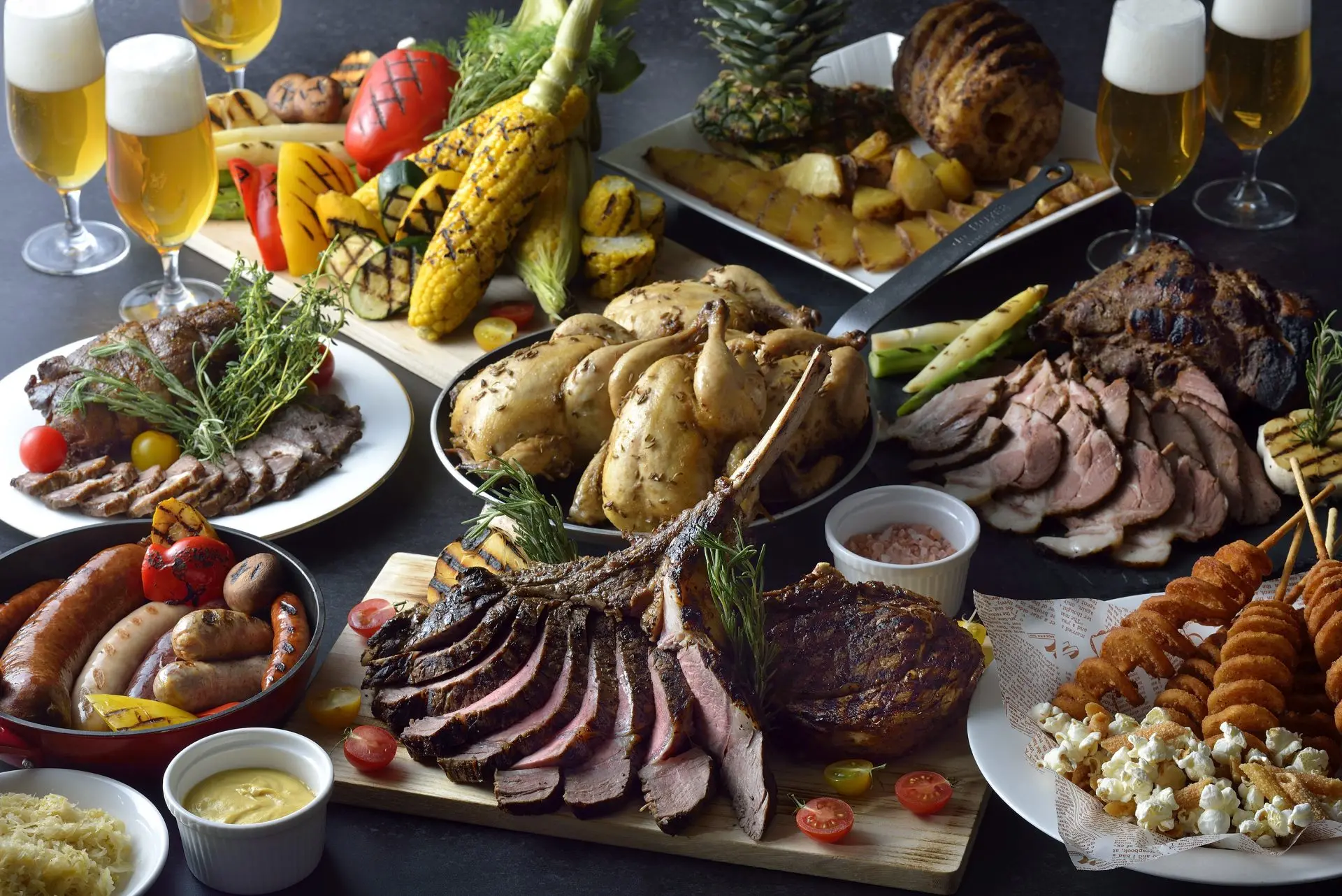 生ビールやクラフトビール、ビアカクテルにウイスキーなど、充実したアルコールとノンアルコールメニューをフリーフローで存分にどうぞ。ビールと共に味わうのは、ドイツ伝統の白ソーセージやチョリソーなど5種類のソーセージに、ビーフトマホークやラムショルダーホットケイジャン、ひな鳥の丸焼きなどスパイスやハーブ香るビールと相性抜群のお肉料理をご用意。また、プルスケッタなどの前菜やバスクチーズケーキなどのデザートも豊富に取り揃えています。