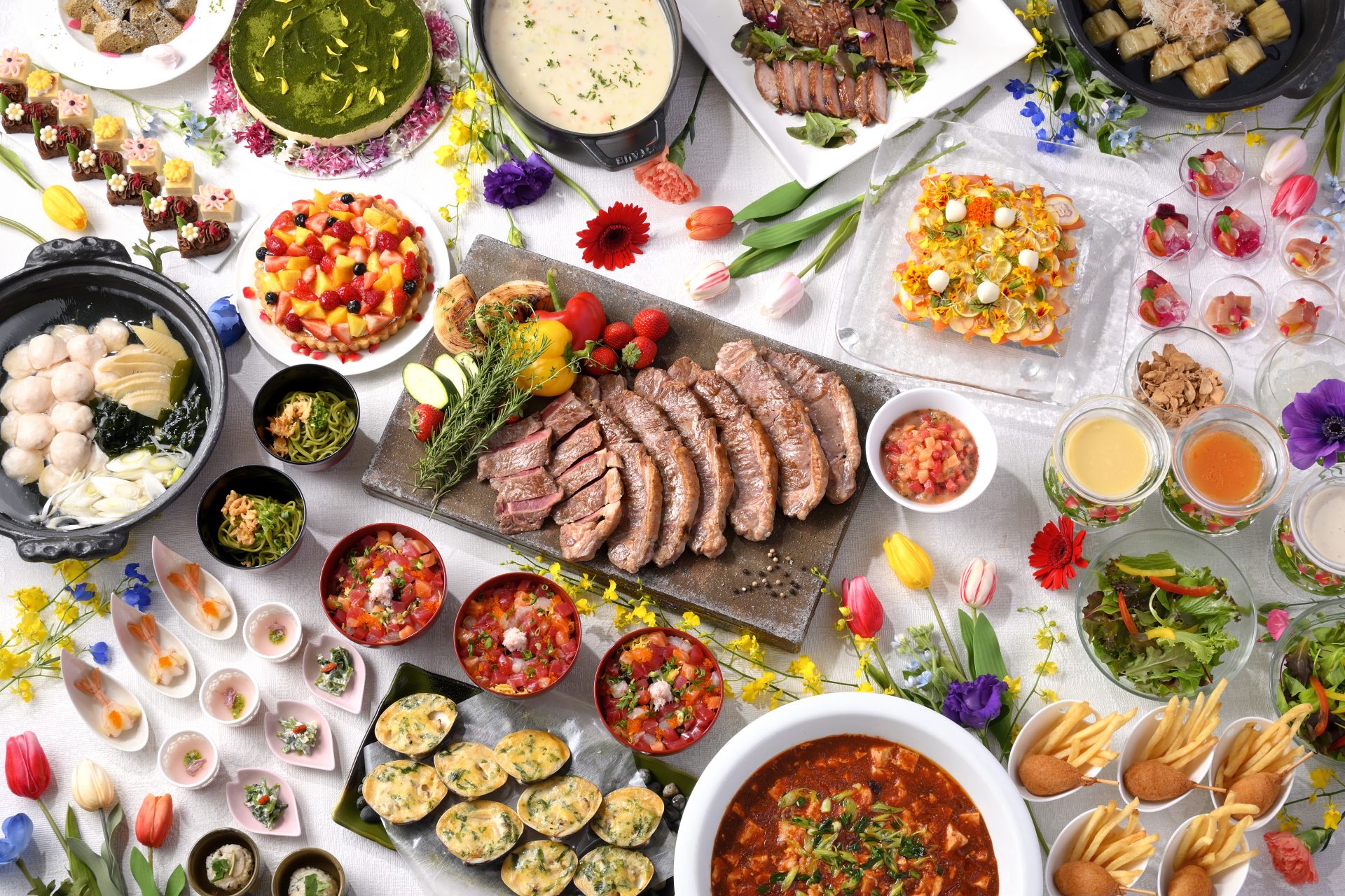 春のランチ& ディナービュッフェのご紹介期間限定の「春のランチ& ディナービュッフェ」では、桜海老や筍など旬の味覚を盛り込んだ料理や桜の香りあふれるスイーツほか多彩な品々をご用意しています。春に咲き誇る花々のように艶やかな美味の饗宴を、ぜひご堪能ください。