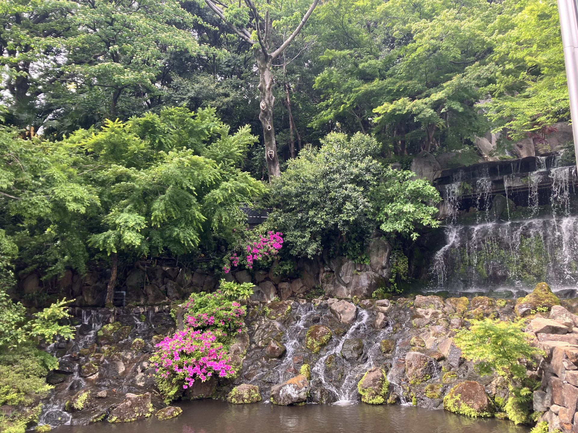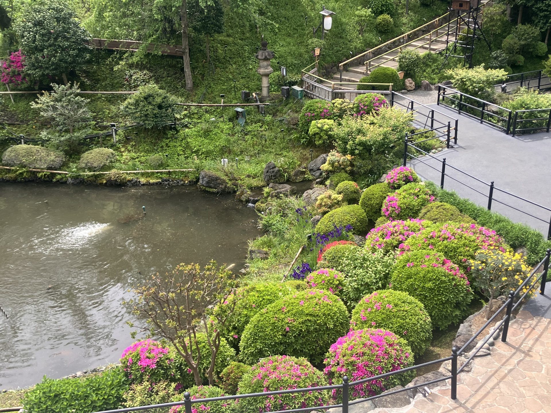 幽翠池付近新緑がきらめく中、あやめとつつじが幽翠池のほとりを鮮やかに染め上げています。