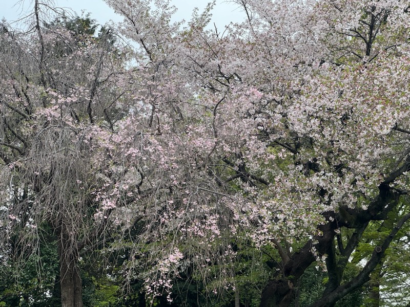 望郷橋付近こちらの八重紅枝垂桜は満開を過ぎ、散り始めています。