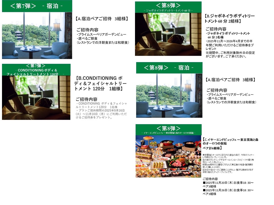 東京都区内に現存する古塔は、旧寛永寺五重塔(江戸時代)と本門寺五重塔(江戸時代)、椿山荘三重塔だけであり、貴重な文化財です。2025年、皆さまの目を100年の長きに渡って楽しませてきた三重塔の歴史に思いをはせ、ホテル椿山荘東京での庭園めぐりをどうぞお楽しみいただきたく、三重塔移築100周年を記念して、年間合計100組様に各種プレゼントをご用意いたします。