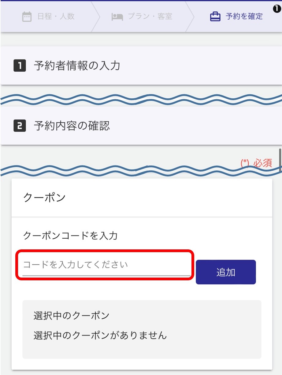①ご予約画面で対象プランを選択後、「予約内容の確認」にて、クーポンコードをご入力ください。
