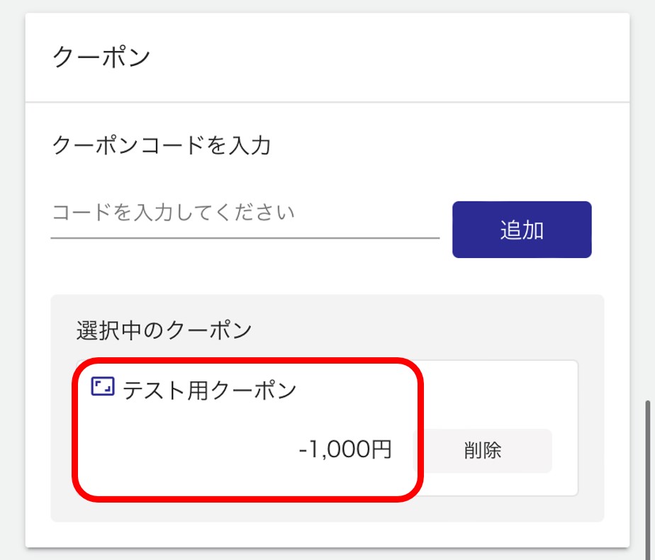 ③「選択中のクーポン」欄に、入力したクーポン内容が表示されていることをご確認ください。