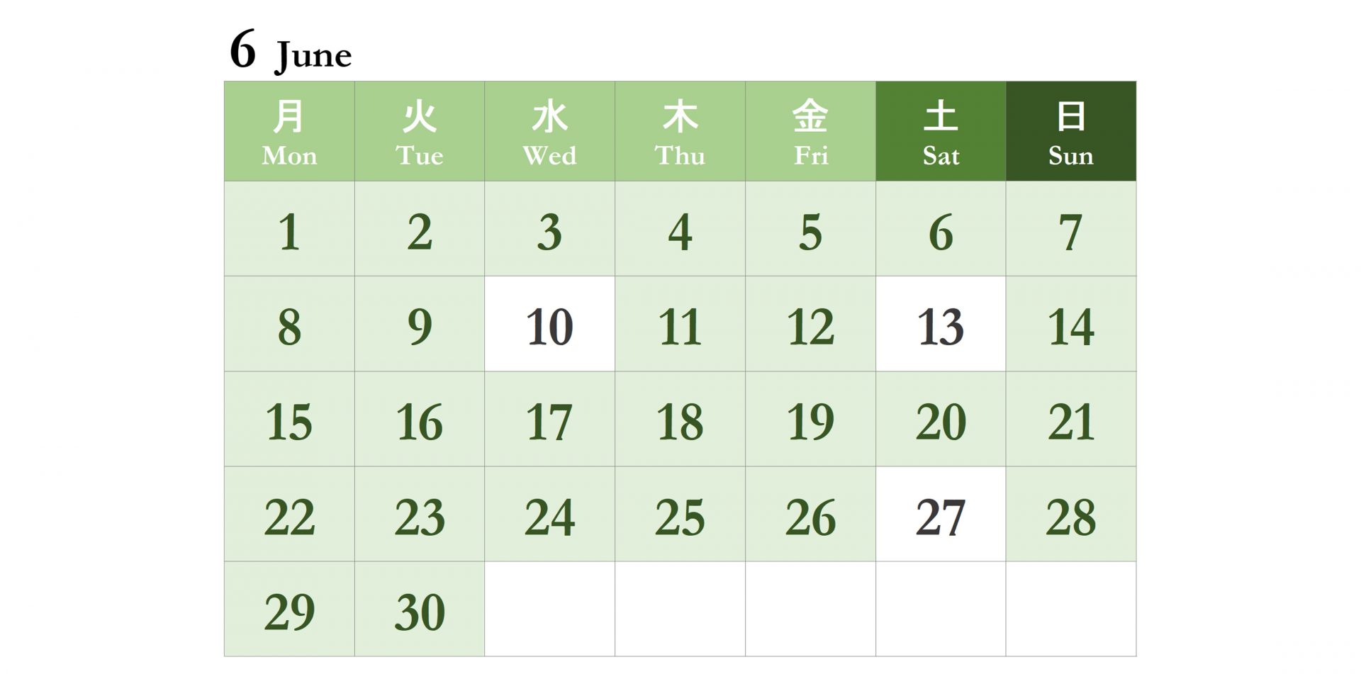 【6月】1日(月)~9日(火)、11日(木)、12日(金)、14日(日)~26日(金)、28日(日)~30日(火)