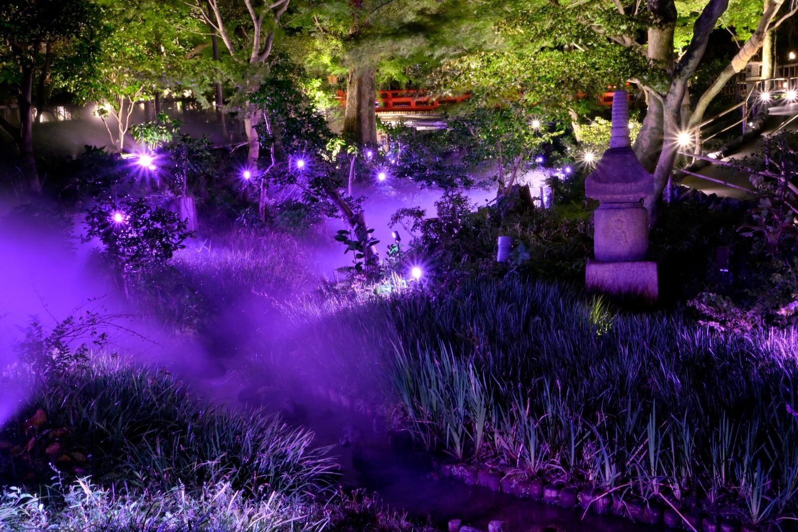 今春は例年の演出に加え、ほたる沢〜望郷橋の水景付近も桜色の光でライトアップ。これまでの幽翠池エリアに加え、水景エリアへと広がり、庭園全体を包み込む演出へ進化いたしました。