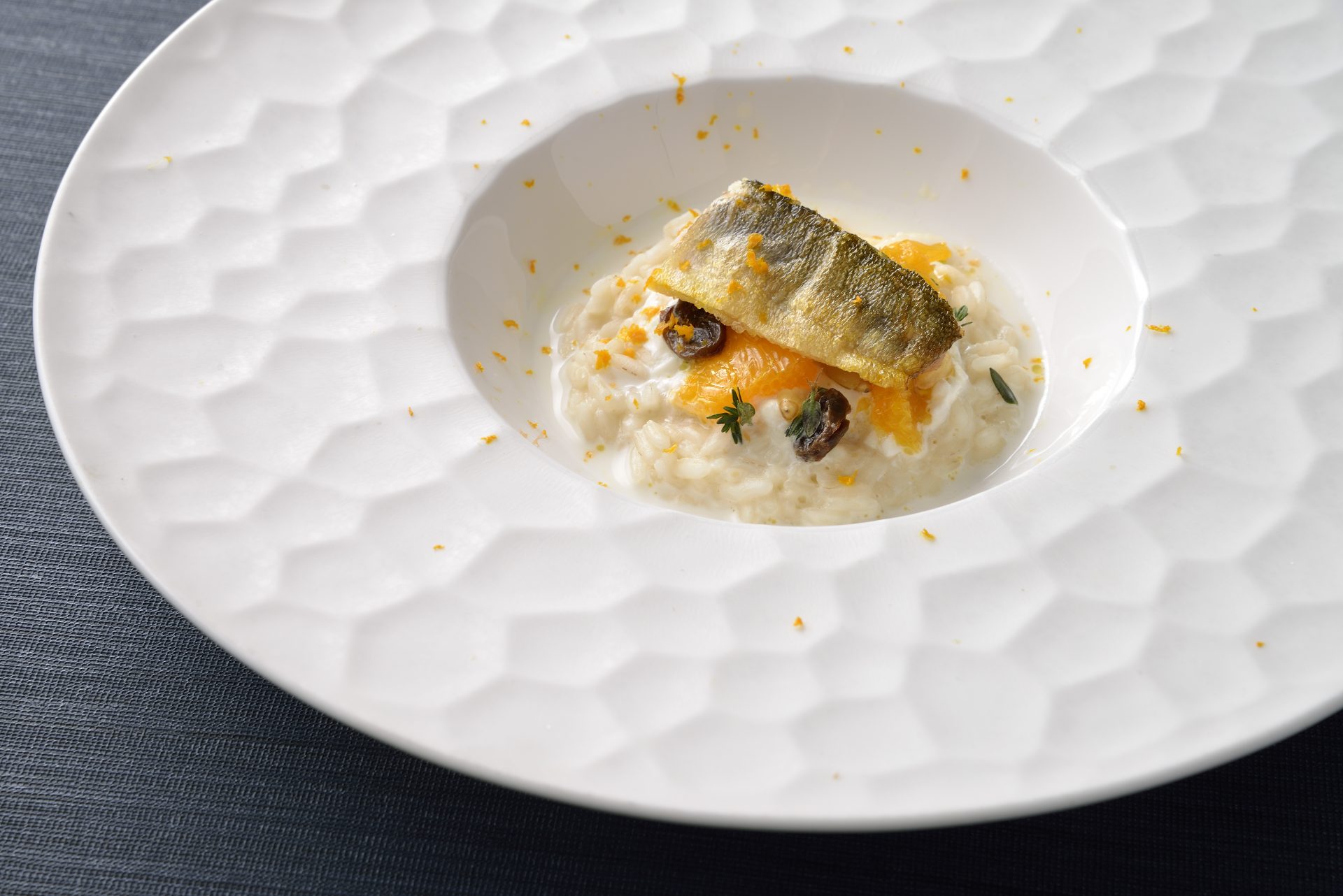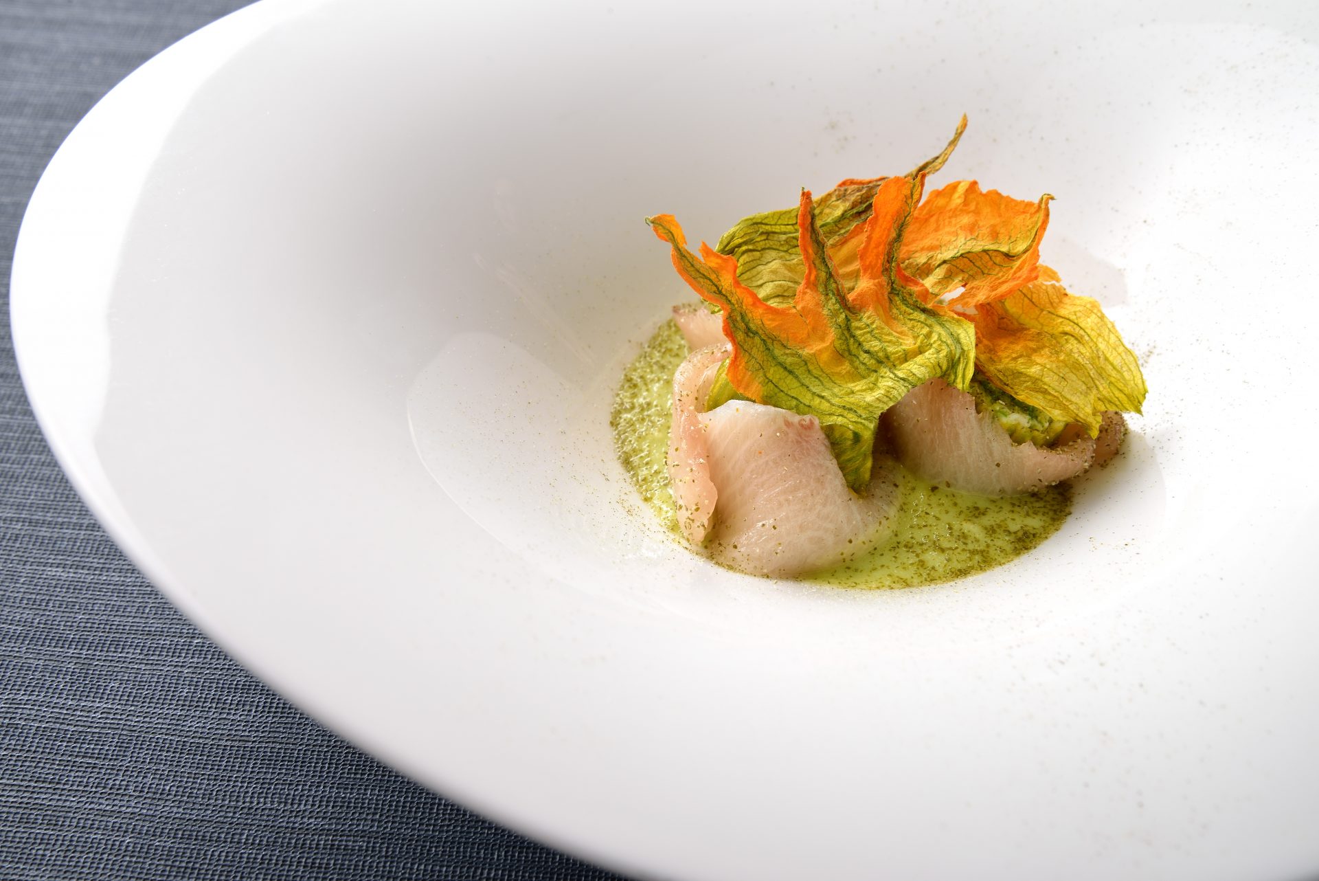 洋のエッセンスに和の趣を織り交ぜた贅沢なディナーコースでは、前菜に伊佐木の昆布締めを用い、花ズッキーニやシチリア産レモンが彩りと清々しい風味を添えます。南イタリアの郷土料理「べッカフィーコ」を再構築したリゾットには、鰯の代わりに旬の鮎を合わせ、オレンジの香りで季節の華やぎをまとわせました。