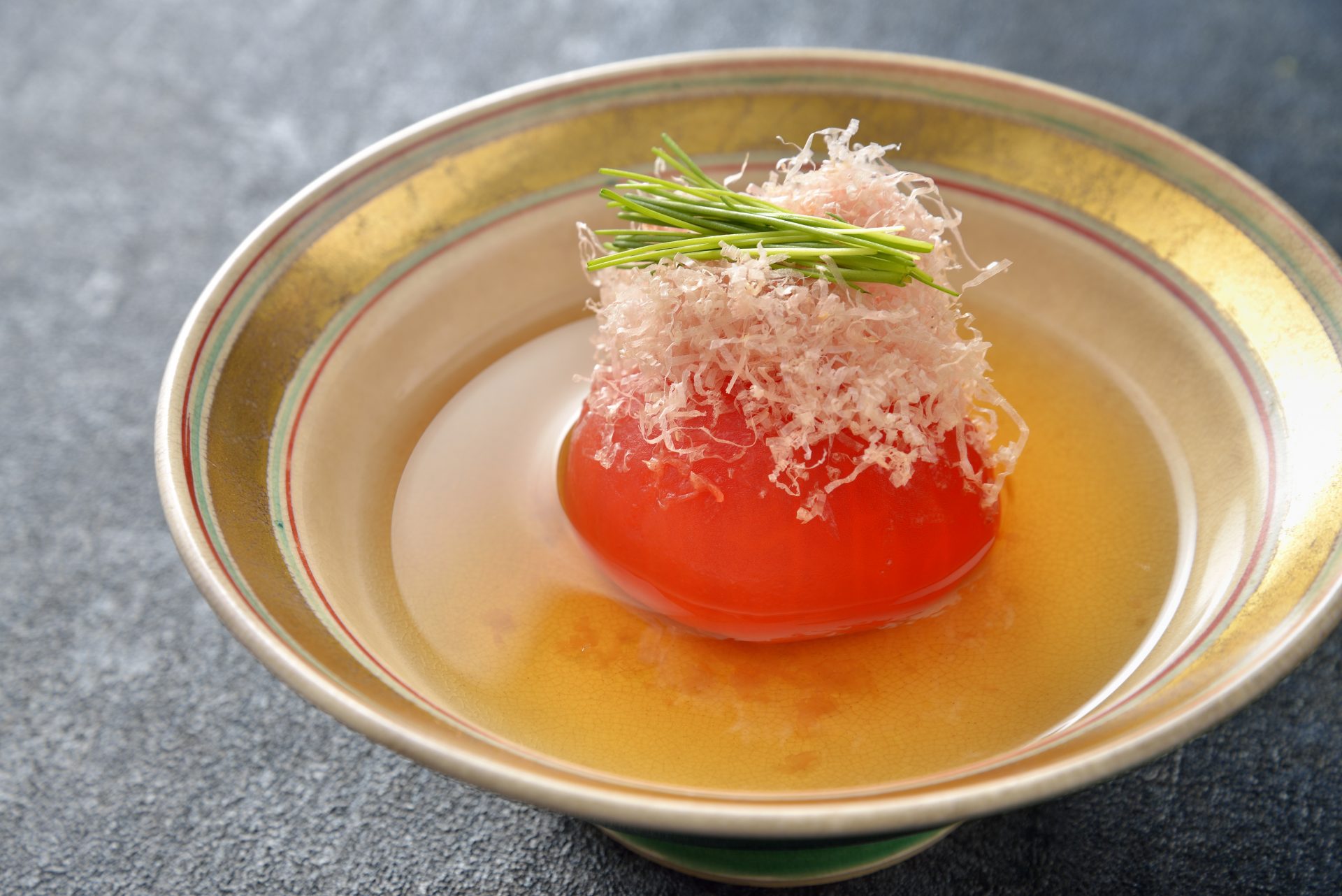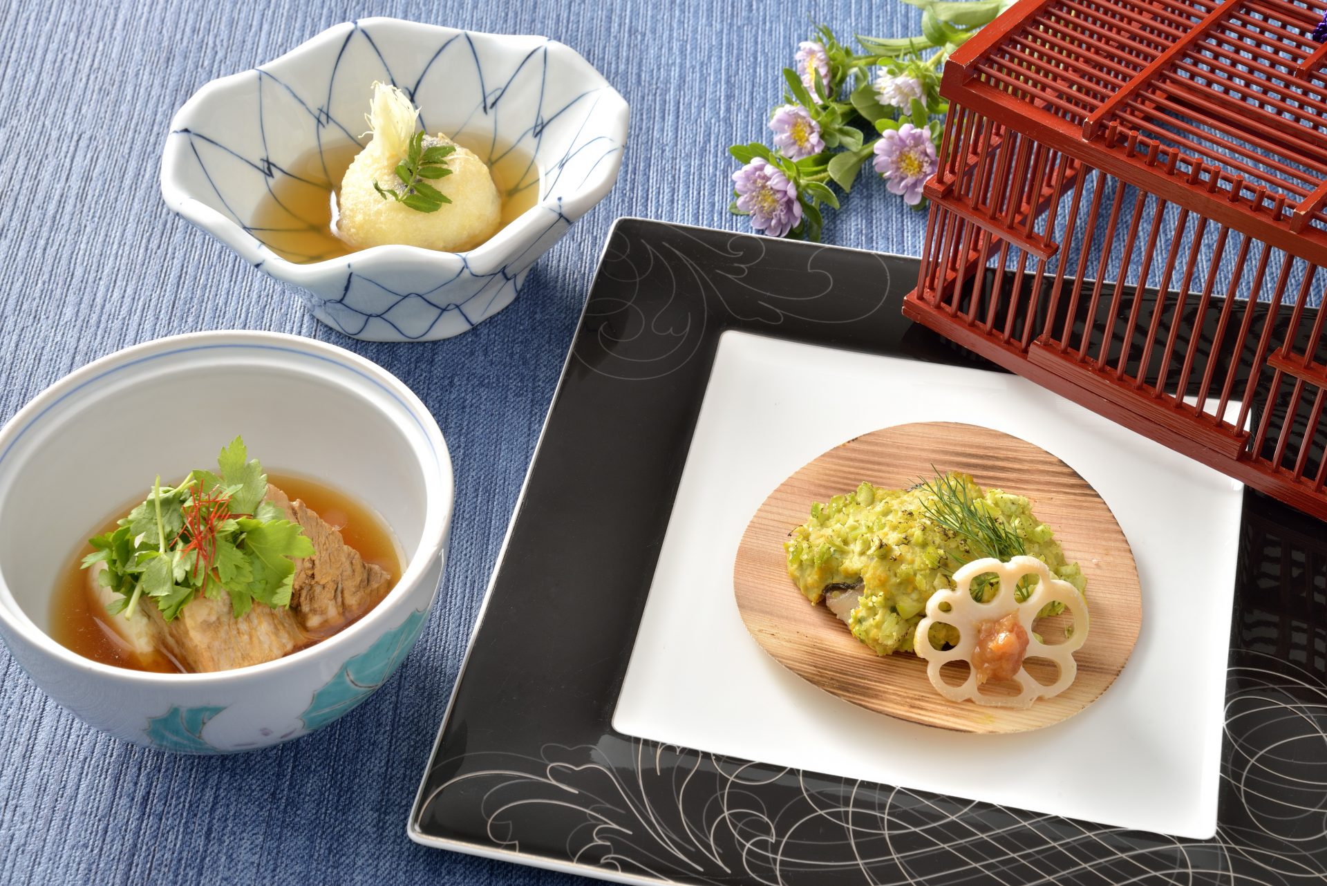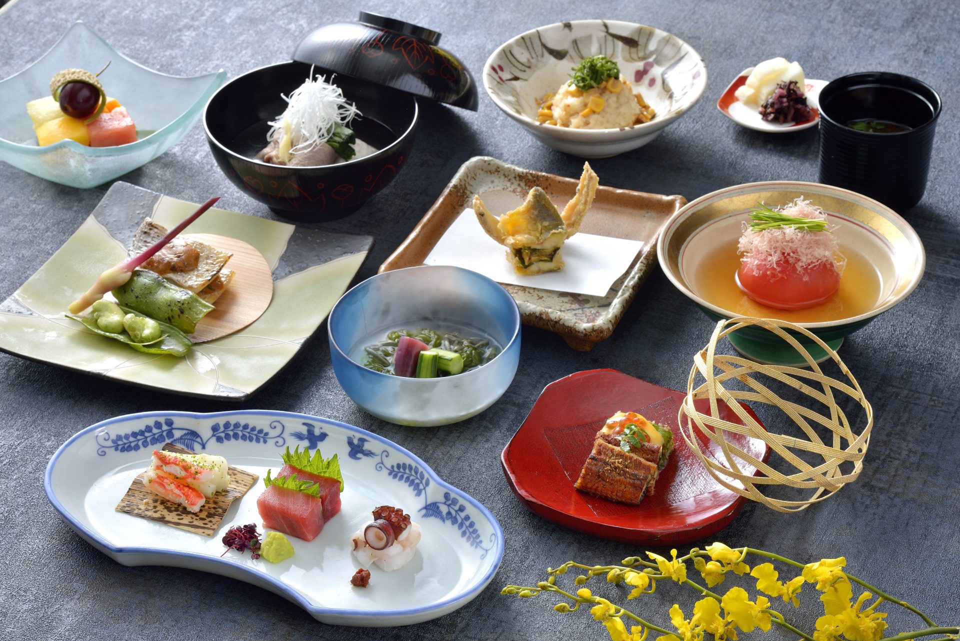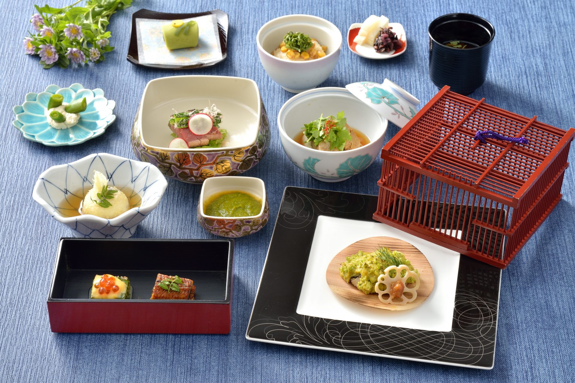 ディナーでは、季節の美味をふんだんに盛り込んだ会席コースで、初夏の夜を贅沢にお楽しみください。鰻ざく寄せの先付からはじまり、黒毛和牛を使った吸物、鰹出汁に旬のトマトを合わせて目にも艶やかに仕上げた鴫炊き、蓼(たで)の葉を鋳込んで揚げた鮎など、この時期ならではの珠玉の味わいを取り揃えています。