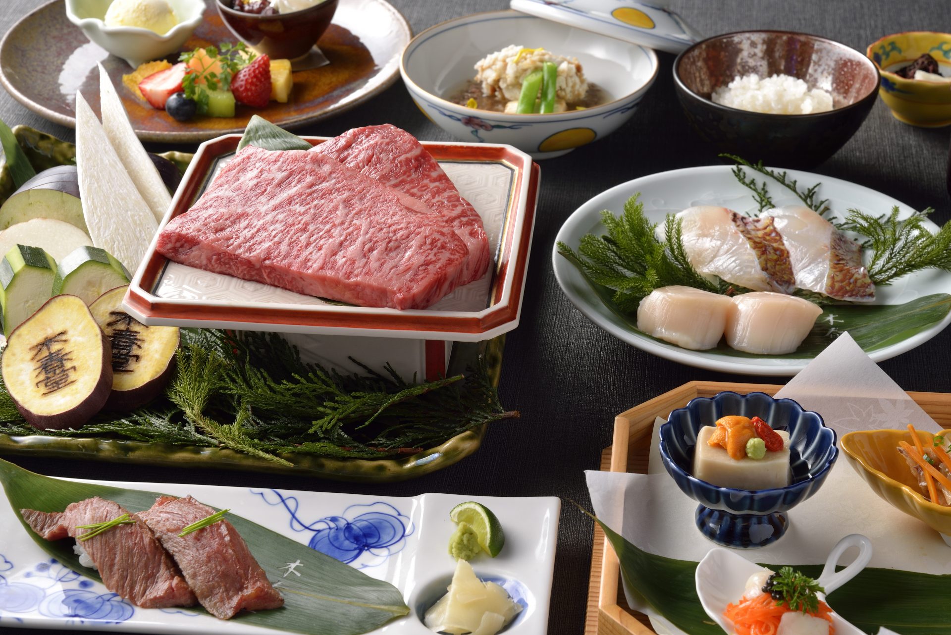 【石 焼】 鯛姿盛り 伊勢海老姿盛 黒毛和牛ロース 野菜三種盛り