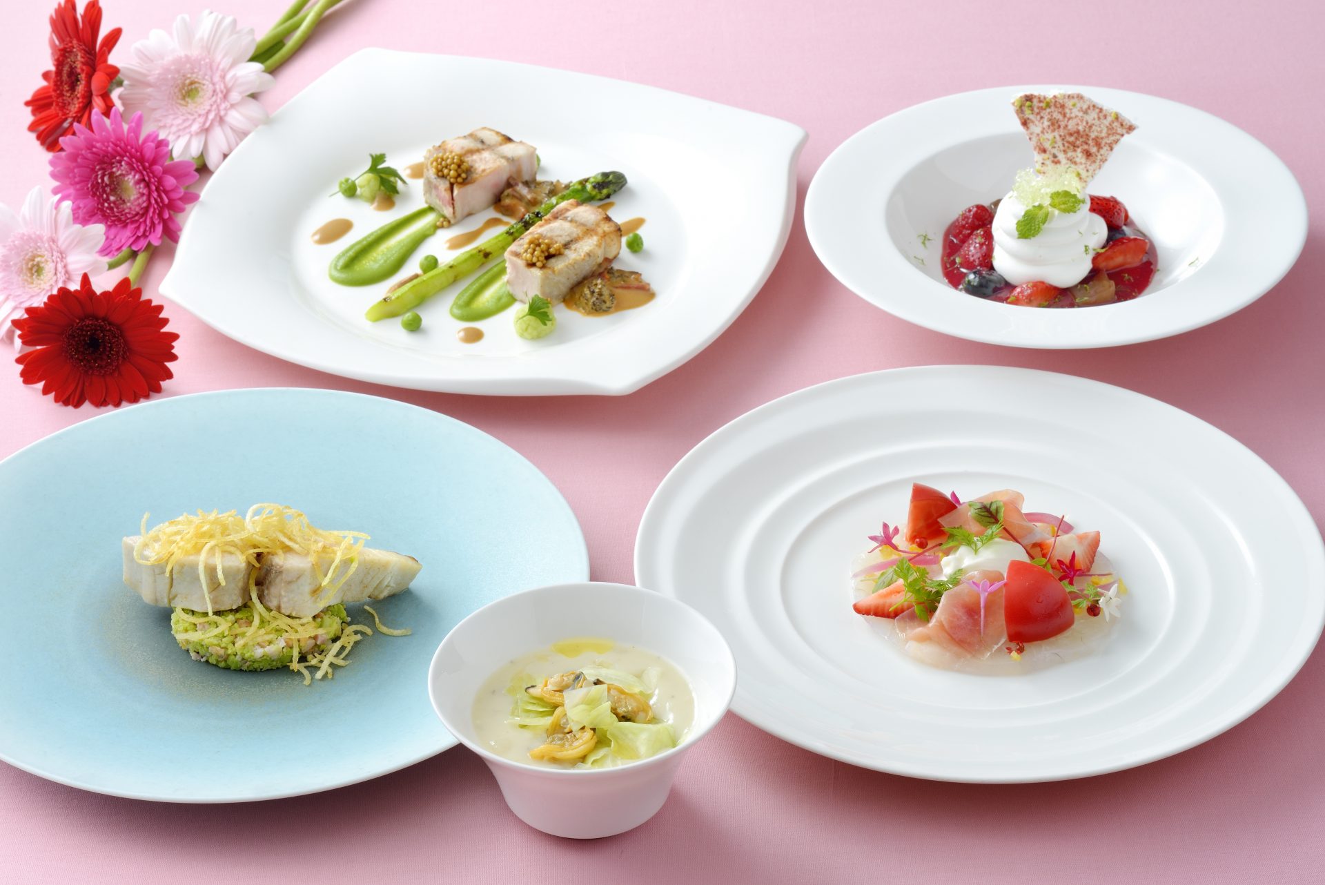 ランチコース「木立」では富士山溶岩石で焼き上げる石焼料理とともに、和のなかにフレンチの趣漂う美味をご賞味いただけます。温物には旬の甘鯛を使った道明寺蒸しを、箸休めには菜の花や苺を添えて春の彩りに仕上げたサーモンマリネをご用意。桜の季節ならではの味わいをゆったりとご堪能ください。
